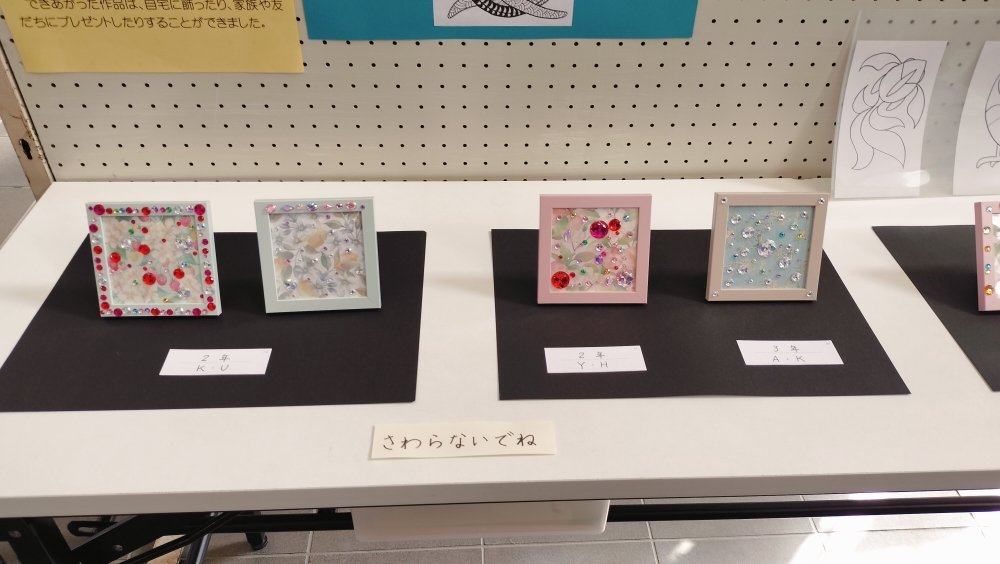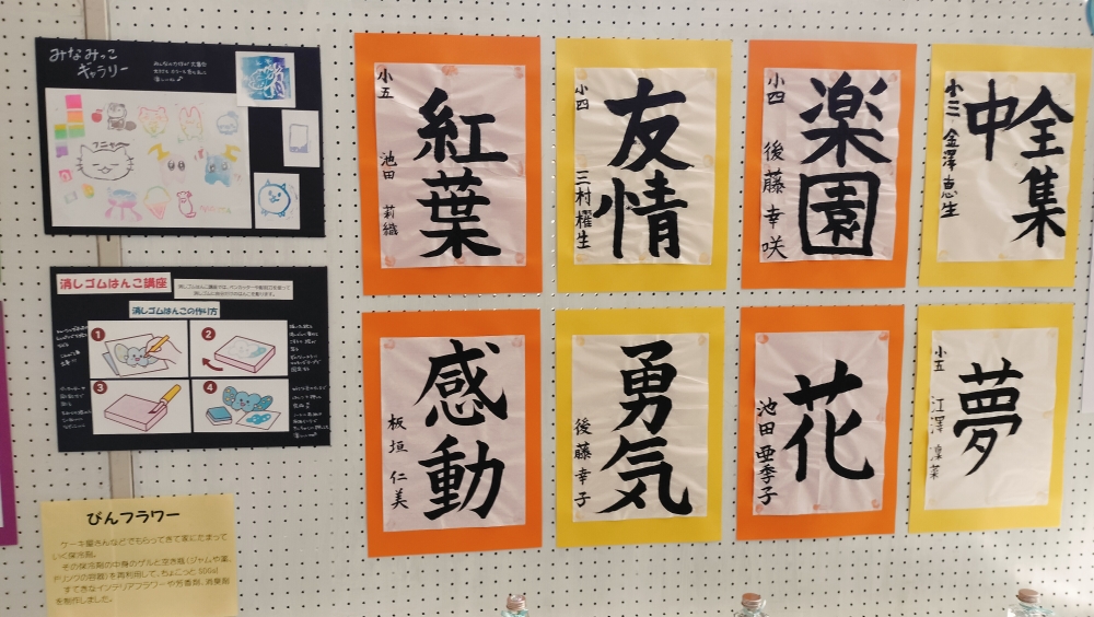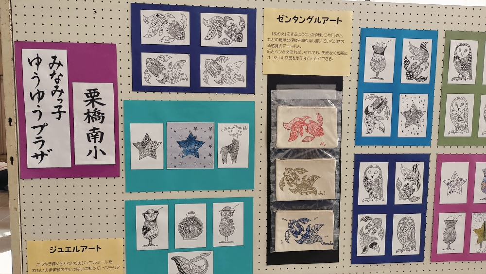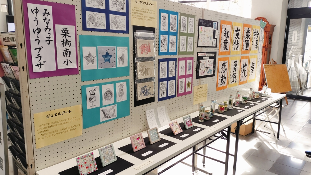 展示コーナーでは、「ジュエルアート」「ゼンタングルアート」「びんフラワー」「消しゴムはんこ」「書道」など、さまざまな講座の作品が並びました。