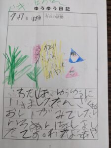 こういう感じで、絵や文はなんでもOK!自分が思ったことや感じたことをたくさん書いてゆうゆうプラザに持っていこう!楽しみにしているよ!!